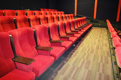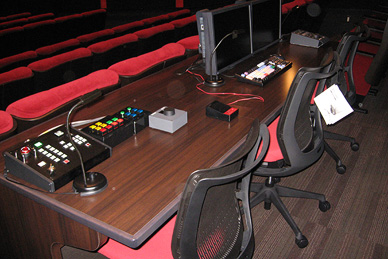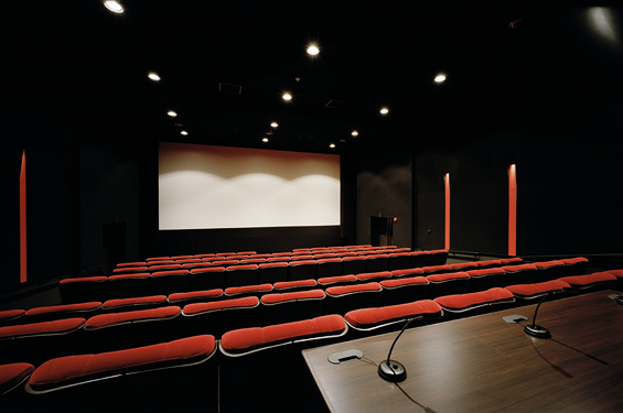 2in size, and the ceiling is 5.5m tall, accommodating 96 seats. Its screen is a Stewart Filmscreen’s Ultramatte 130, its size at 8.3m x 3.4m. The horizontal projection allows for strain-free video image. The Theater is equipped with 2K DLP Cinema and 35mm film projector, allowing for projection in all types of format. The Theater has a NC rate of 10, and is equipped with sound systems that are capable of reenacting the exact same sounds recorded at the dubbing stage. Images may also be projected from the editing rooms.