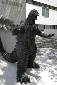 ゲートのもうひとつの脇には、東宝のシンボル・キャラクター「ゴジラ」のブロンズ像がお目見えします。全高2メートルの堂々たる体は黒く光り、建物をも破壊する躯体は力強さに溢れています。