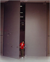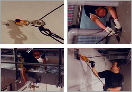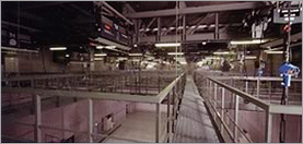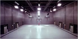 センターのワイドな開口部は高さ5.5m×幅4.5mで大型車両の搬入も楽々、外側は防音シャッター、内側は軽量な大扉を配置しています。遮音性も極めて高く同時録音に最適です。国際的評価も高いイタリアIFF社製の可動式自動昇降バトンを日本で初めて採用、自由自在なライティングが可能です。また、ワイヤーアクションを簡易にこなせるように、床面や壁面、キャットウォーク上に全体で180個のワイヤーフックを用意しています。