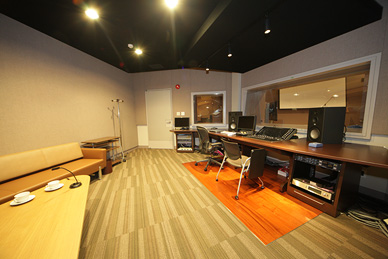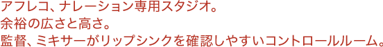 広さ78m2は20人以上が入っても充分な広さ。ソルター社の設計の下、NC10の高い遮音性と、静謐さを獲得。コントロールルームはスタジオを斜めに望む配置。ミキサー、監督が、リップシンクを確認しやすい視線を追求しました。